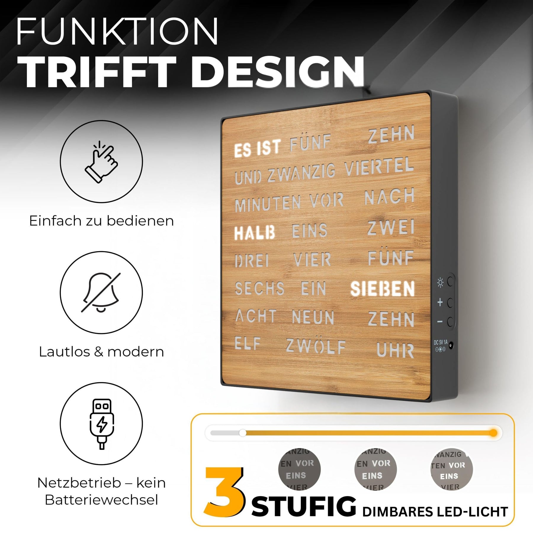 • ✨𝗘𝗟𝗘𝗚𝗔𝗡𝗧𝗘𝗦 𝗗𝗘𝗦𝗜𝗚𝗡 - Diese außergewöhnliche LED Metalluhr im edlen Design wird sie begeistern. Nutzen Sie sie als Tisch- oder Wanduhr. Die aktuelle Uhrzeit leuchtet dann in deutschen Worten auf (lautlos) und ist ein echter Blickfang.